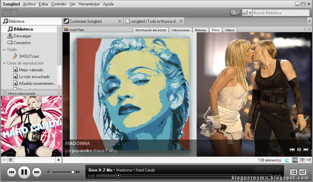 Si el diseño de Songbird no es de nuestro agrado podemos cambiarlo descargando temas y complementos para mejorar la apariencia, la funcionalidad de navegador web, la de reproducción y administración de nuestras canciones, etc. Entre mis favoritas se encuentran el MediaFlow para visualizar nuestra biblioteca de música mediante la imagen de la portada del álbum y el LiveTweeter para notificar lo que estamos escuchando mediante Twitter, o como mensaje personal en Msn/Windows Live Messenger, Pidgin y Mercury.